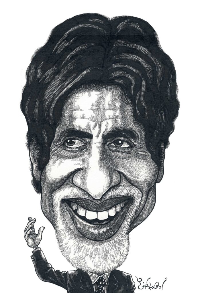 This hilarious yet heartwarming caricature of Amitabh Bachchan Sir is proof that even exaggerated lines can’t exaggerate his greatness — because the man truly is larger than life! Drawn by a passionate fan, this piece celebrates the megastar’s million-dollar smile, iconic hairstyle, and that unmistakable aura that needs no introduction.