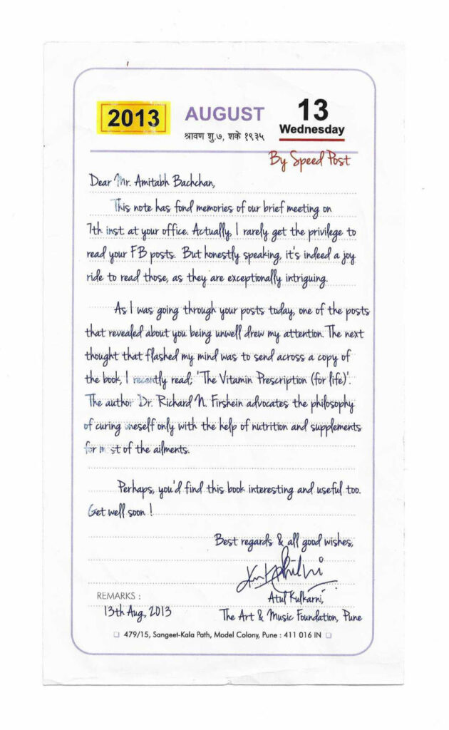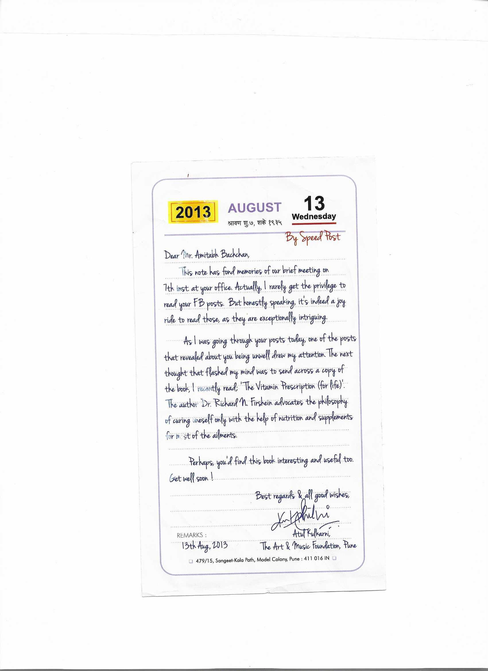 This thoughtful letter, was sent by a fan to Amitabh Bachchan Sir ๐. Recalling a cherished meeting and expressing admiration for his engaging Facebook posts, the fan goes a step further by recommending a book on health and healing, hoping it might be useful for the superstar’s well-being ๐๐. A beautiful blend of intellect, care, and fan admiration โ sent with warmth and genuine concern. ๐ซ๐